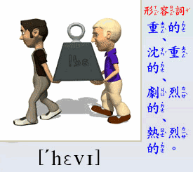 - [形容詞] 重的, 沈的, 沈重有力的, 劇烈的, 熱烈的.