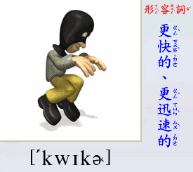 - [形容詞] 更快的, 更迅速的. (quick 的比較級)