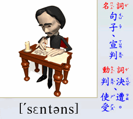- [名 詞] 句子, 宣判. (複數為 sentences)