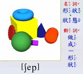 - [名 詞] 形狀, 狀態.