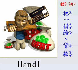 - [動 詞] 把 … 借給, 貸(款).