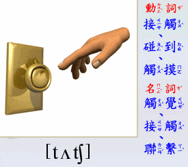 - [名 詞] 觸覺, 接觸, 聯繫.
