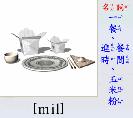 - [名 詞] 一餐, 進餐時間, 玉米粉.