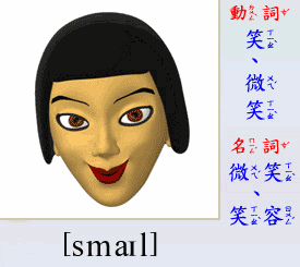 - [名 詞] 微笑, 笑容, 恩惠, 好意.