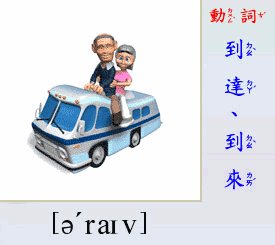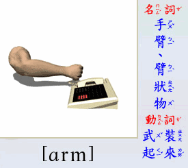 - [名 詞]  手臂, 臂狀物. (如椅子的扶手, 起重機等的臂桿) (複數為 arms)