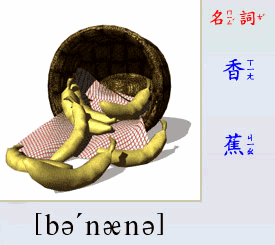 - [名 詞]  香蕉, 香蕉味, 草黃色.