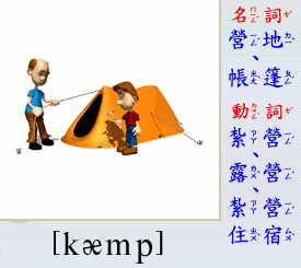 - [動 詞]  紮營, 露營, 使紮營住宿.