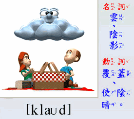- [名 詞]  雲, 雲狀物, 陰影, 黑斑.