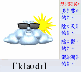 - [形容詞]  多雲的, 陰天的, 陰鬱的, 含糊的, 混濁的.